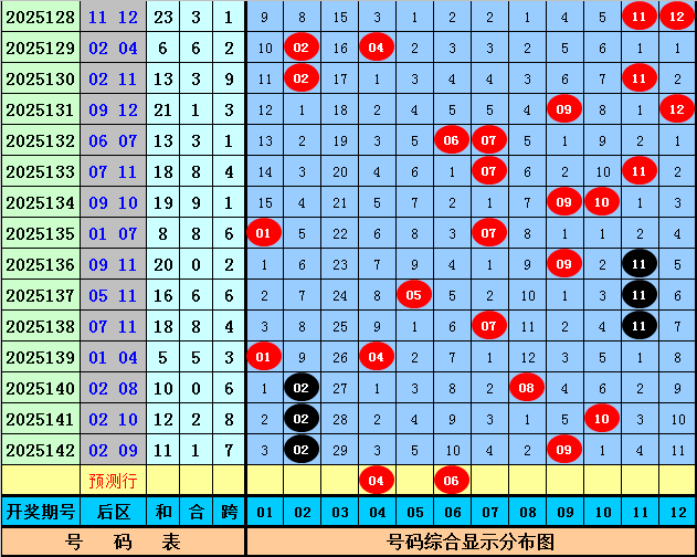 后区上期开出奖号02和09,该组合历史上出现了47次,其下期奖号频次分别为:号码07、11出现11次,01、02、03、06、08出现8次,04、05出现7次,12出现6次,09、10出现5次,本期后区参考号码02、03、04、06,精选两码04和06。