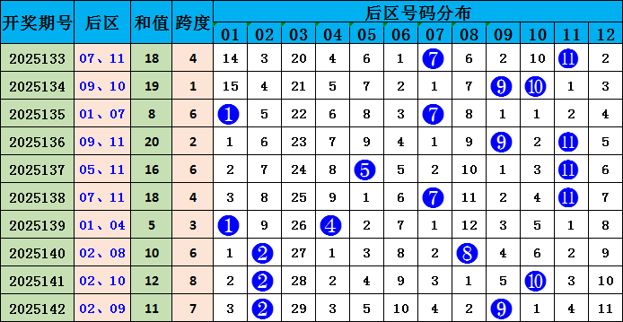 前区冷号分析(9以上):上期冷号出现在第二区,开出1个14,冷码出号相对较冷;最近8期开出9冷号,冷号出号相对较少。本期适当关注冷号解冻,参考17。