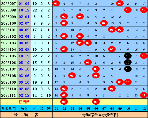 后区分析:上期后区开出奖号02、12,为一大一小、全偶组合。