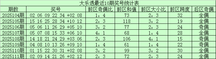 大乐透第25111期奖号为:02、09、14、21、26+02、12。其中前区和值为72,奇偶比为2:3,大小比为2:3。后区为一大一小、全偶组合。