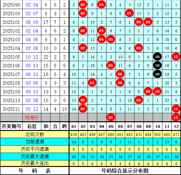 其中,后区奇偶比为14:26,大小比为20:20,012路比为11:15:14,本期后区金胆参考05。