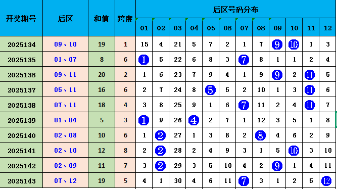 上期后区开出号码07、12,和值19,最近十期,和值开出范围在5--20之间,波动较大。本期预测和值较上一期下降,精选一注后区和值17,推荐05、12。