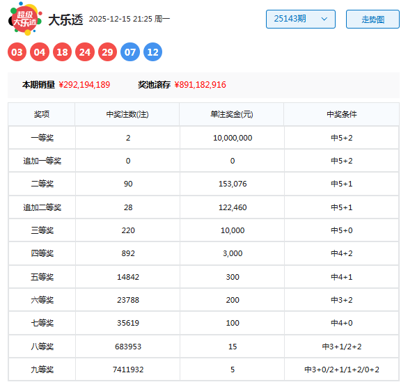 大乐透第25143期开奖。当期开奖号码为:前区03 04 18 24 29,后区07 12。当期前区号码大小比为3:2,奇偶比为2:3,三区比2:2:1;前区开出1枚重号29,开出1组连号03 04;后区开出大大组合07 12。