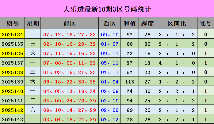后区开出号码07、12落在2、3区。最近50期,一区(1-4)开出号码30个,二区(5-8)开出号码34个,三区(9-12)开出号码36个,2、3区号码较热,1区较温,本期推荐关注:03、08