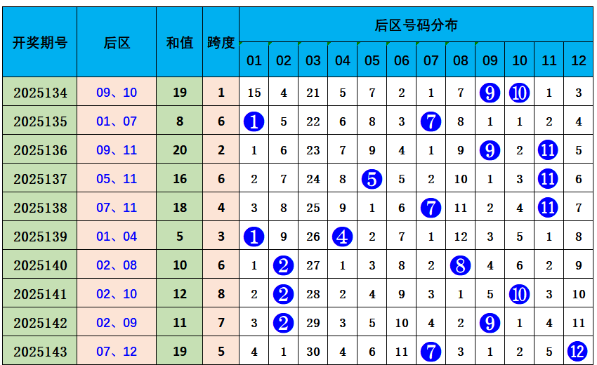上期后区开出奖号07、12,奇偶比1:1,近10期奇偶比12:8,奇数奖号开出较多,本期推荐奇偶比0:2,参考后区号码02、08。