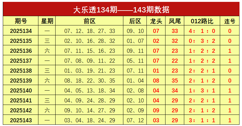 大乐透第2025143期出奖号统计:前区03、04、18、24、29,后区07、12。龙头03,凤尾29,012路比为3:1:1,开出1组连号。