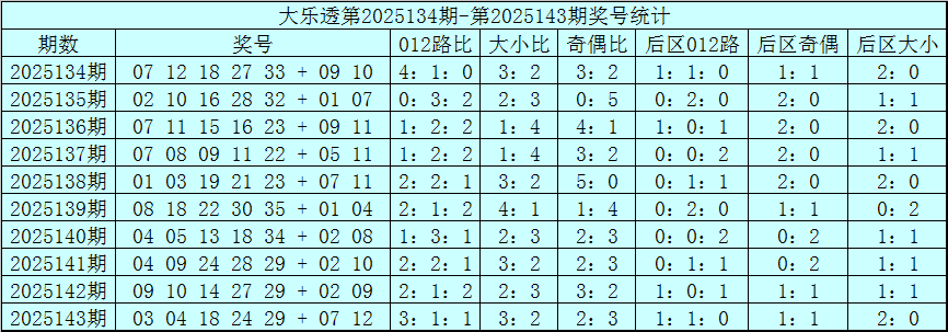 体彩大乐透第25143期奖号为:03 04 18 24 29+07 12,前区奖号012路比为3:1:1,奇偶比为2:3,大小比为3:2,后区2路号码轮空。