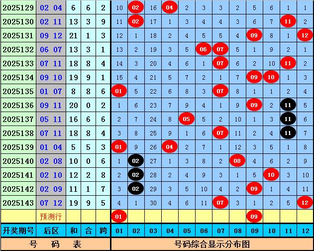 后区分析(一区01-04,二区05-08,三区09-12):上期后区开出奖号07和12,最近10期后区三区落号比为6:10:9,本期后区关注号码01、02、07、09、12,后区两码参考01、09。