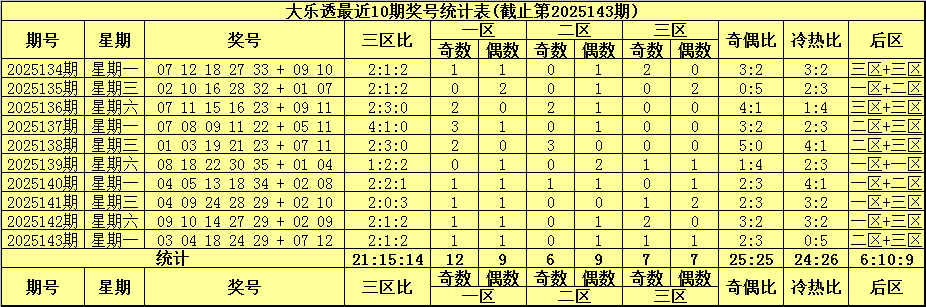 综上所述,大乐透第2025144期前区三区比看好3:1:1。