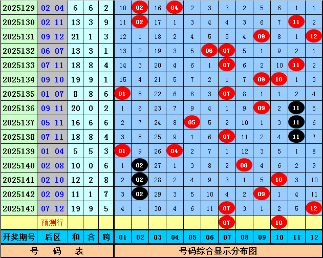 后区上期开出奖号07和12,该组合历史上出现了46次,其下期奖号频次分别为:号码05出现12次,02、03、11出现9次,06、12出现8次,04、08、09出现7次,01、07出现5次,10出现4次,本期后区参考号码07、08、09、10,精选两码07和10。