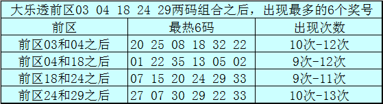 前区两码03和04和之后表现最热的6个号码为:20、25、08、18、32、22;
