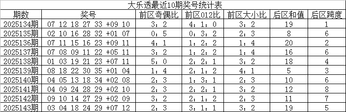 大乐透第2025143期奖号为:03 04 18 24 29+07 12。当期前区奖号012路比为3:1:1,冷热比为1:4,包含1个重号:29,包含连码组合03 04,后区开出一奇一偶、全大组合。