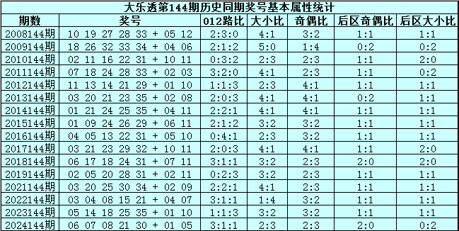 大乐透第2025144期历史同期号码分析: