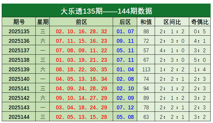 大乐透第2025144期出奖号统计:前区02、05、13、15、28,后区05、08。和值为63,区间比为2:2:1,奇偶比为3:2。
