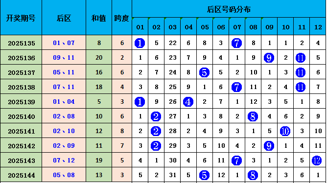上期后区开出号码05、08,和值13,最近十期,和值开出范围在5--20之间,波动较大。本期预测和值较上一期持平,精选一注后区和值13,推荐02、11。