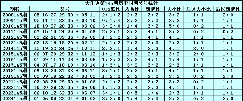 体彩大乐透第2025145期历史同期开奖号码分析: