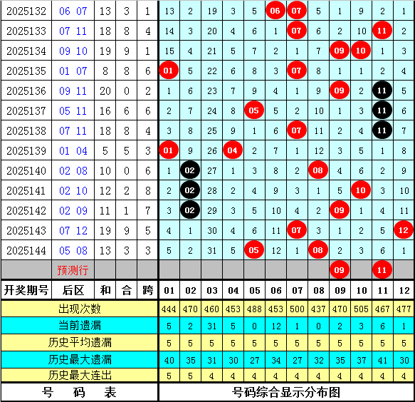 其中,后区012路比2:10:8,奇偶比9:11,大小比10:10,本期一码看好11。