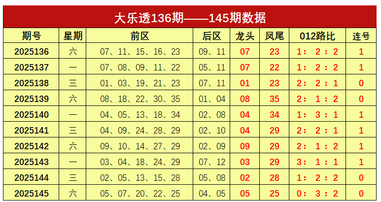 大乐透第2025145期出奖号统计:前区05、07、20、22、25,后区04、05。龙头05,凤尾25,012路比为0:3:2,未开出连号。