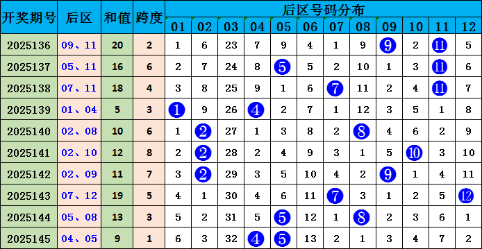 后区分析:上期后区开出号码04、05,为小小偶奇组合。