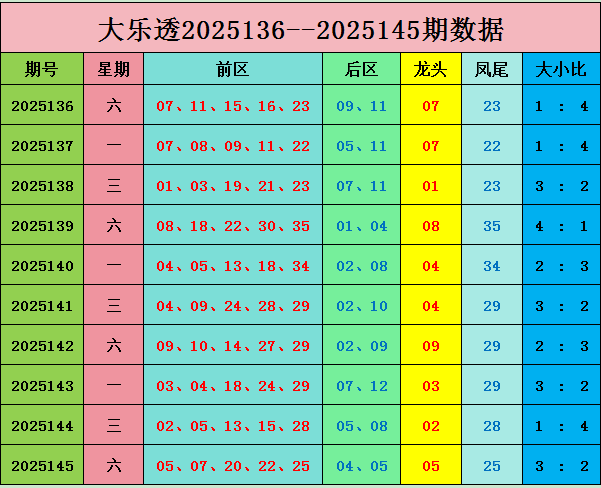 大乐透第2025145期奖号为:前区05 07 20 22 25,后区04 05;奇偶比3:2,大小比:3:2.