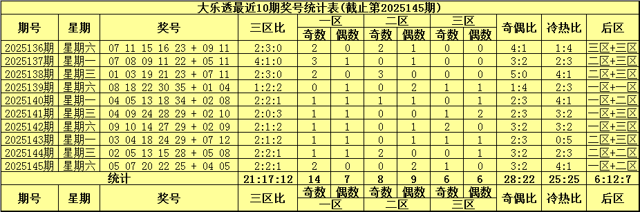 综上所述,大乐透第2025146期前区三区比看好2:2:1。