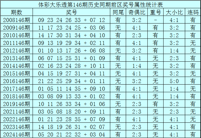 体彩大乐透第146期历史同期开出16次奖号,其统计详见下表: