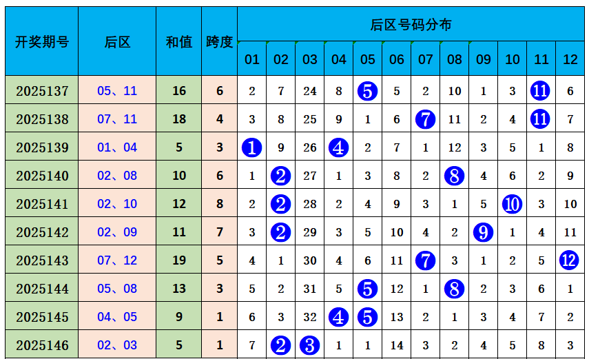后区上期开出号码02、03,为偶奇组合,近十期后区奇偶比为10:10,奇偶数走势均衡,本期后区参考奇偶比1:1,重点两码推荐03、12。