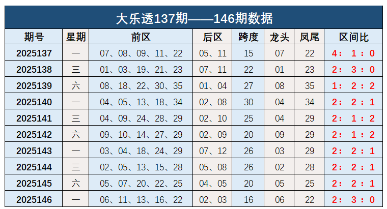 大乐透第2025146期出奖号统计:前区06、11、13、16、22,后区02、03。前区跨度16,龙头06,凤尾22,区间比比2:3:0。