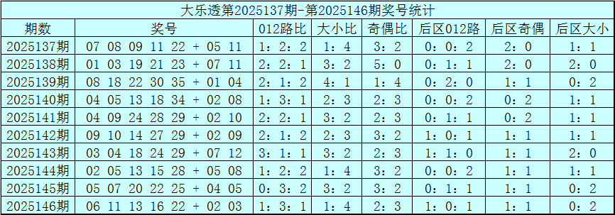 赵研大乐透第2025147期奖号012路分析: