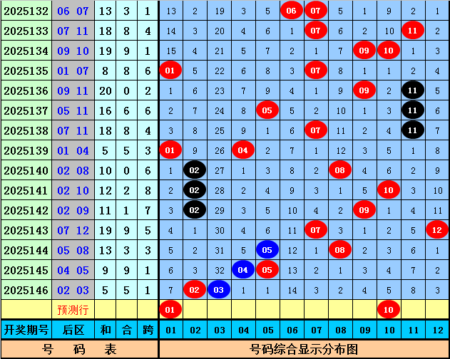 后区第一位分析:在第147期历史同期开奖中,该位号码升重降次数比为6:1:8,出现范围在01-11区间,最近5年后区第一位号码升重降次数比为2:0:3,出现范围在01-09,与最近几年同期号码相比,今年第147期注意该位号码转向上升,参考号码01。