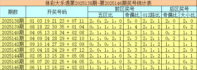 体彩大乐透第2025146期奖号为06 11 13 16 22 + 02 03,前区号码五区比为1:2:1:1:0,奇偶比为2:3,012路比为1:3:1,后区号码奇偶比为1:1,大小比为0:2。