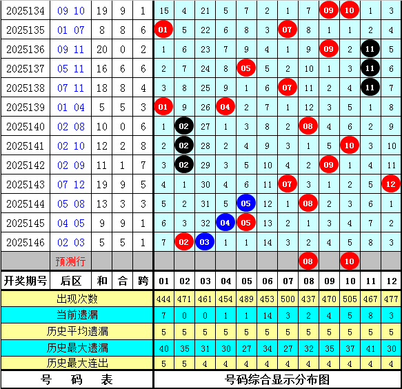 石浩第2025147期大乐透后区分析:后区上周星期三后区奖号为05和08,上期开出奖号02和03,最近9周星期三与最近9期后区奖号奇偶比分别为7:11和8:10,大小比分别为9:9和8:10,本期看好后区出现全偶组合,关注号码04、08、10、12。