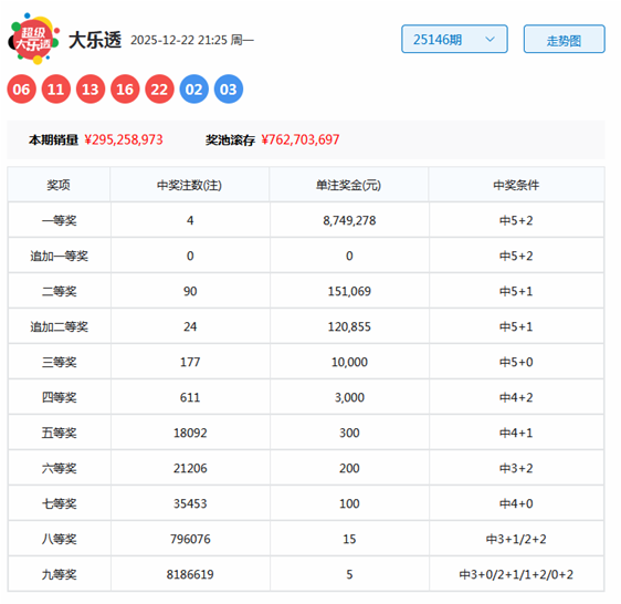 上期开奖:大乐透第2025146期开奖号码为:06、11、13、16、22+02、03。