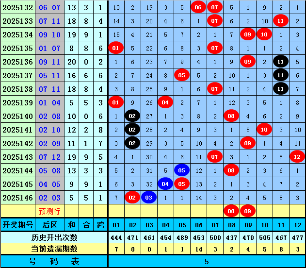 后区分析【一区01-04,二区05-08,三区09-12】:上期后区奖号为02和03,全部出现在第一区,近50期后区三区比为33:34:33,近10期三区比为8:7:5,本期注意第二、三区号码出现,关注两码08+09。