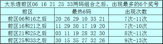 前区两码06和16和之后表现最热的6个号码为:20、26、29、10、33、21;