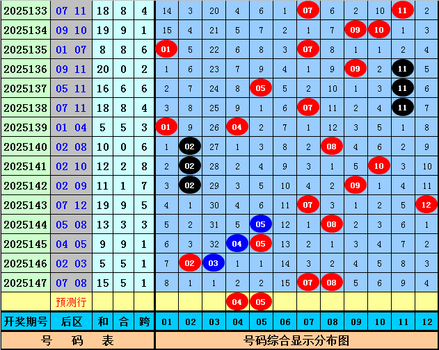 后区上期开出奖号07和08,该组合历史上出现了41次,其下期奖号频次分别为:号码07出现11次,03出现10次,10出现9次,09出现8次,01、04、05、08出现6次,11、12出现5次,02、06出现4次,本期后区参考号码02、04、05、10,精选两码04和05。