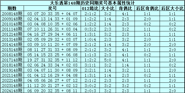 大乐透第2025148期历史同期号码分析: