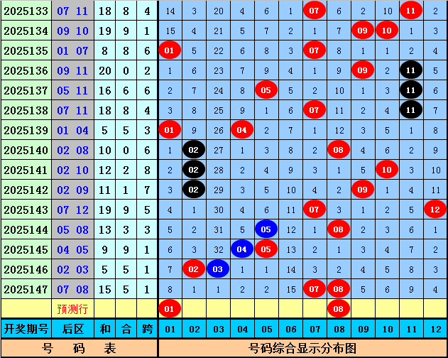 后区推荐:第148期历史同期后区奇偶比总比例为15:17,奇数走势较冷,本期注意回补,关注一奇一偶组合,两码参考01、08。