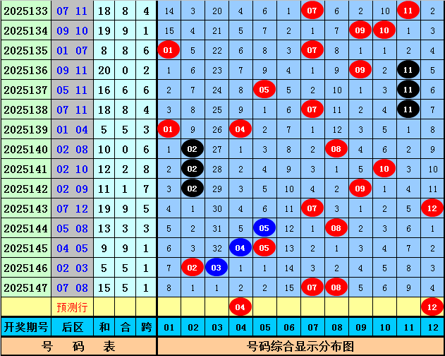 后区分析:后区上期开出号码07和08,分别遗漏3期和2期,目前后区01-12区间冷温热号码个数比为1:5:6,本期后区注意号码04+12。