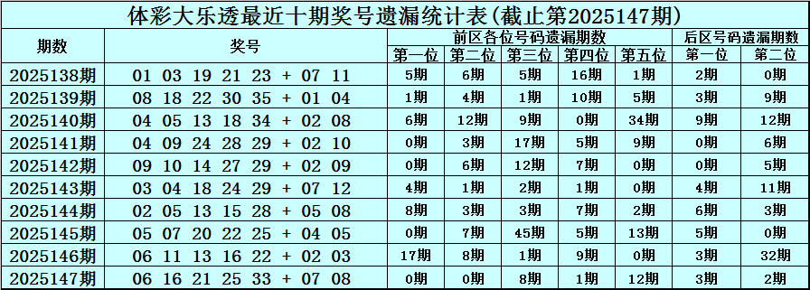 第2025147期奖号:06 16 21 25 33 + 07 08 ,各位号码遗漏期数为:0期、0期、8期、1期、12期 + 3期、2期。