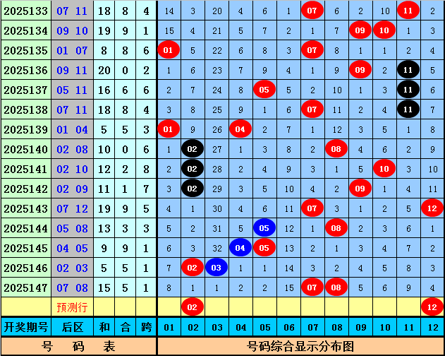 后区奖号分析:上期后区开出奖号07+08,奖号和值为15,跨度为1,本期预计后区和值转小,关注两码02 12。
