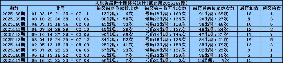 体彩大乐透第2025147期奖号为:06 16 21 25 33+07 08,前区号码大小比开出3:2,012路比开出3:2:0,奇偶比开出3:2,后区号码和值开出15,跨度开出1。