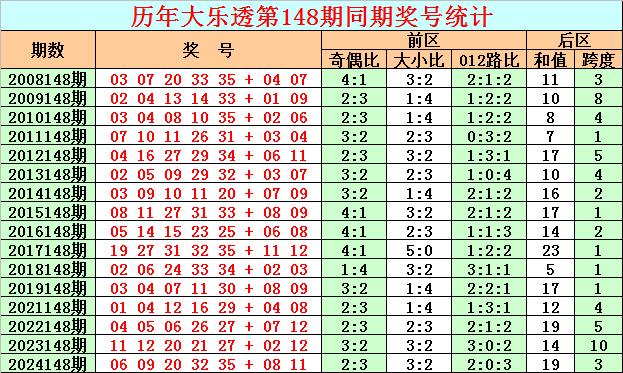 在历史同期奖号中,后区奖号跨度尾数大小比为6:10(定义:跨度1、2、3、10、11为小尾跨度,跨度4、5、6、7、8、9为大尾跨度),其中大尾跨度出现频次较低,本期防大尾跨度回补,参考跨度7。