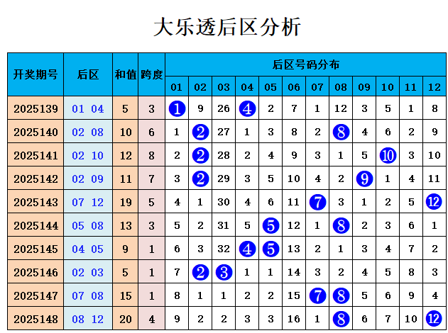 上期回顾:大乐透第2025148期奖号为:前区03、04、14、30、32,后区08、12,前区奖号012路比为2:1:2,奇偶比为1:4,后区开出2路、0路组合08、12