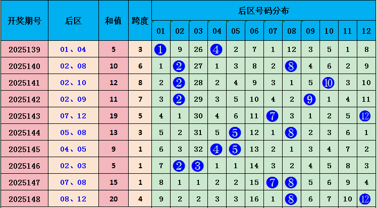 上期后区开出号码08 12,和值20,近十期和值5 10 12 11 19 13 9 5 15 20,和值波动范围较大,本期预测和值会上升,重点关注号码:11 12,和值23。