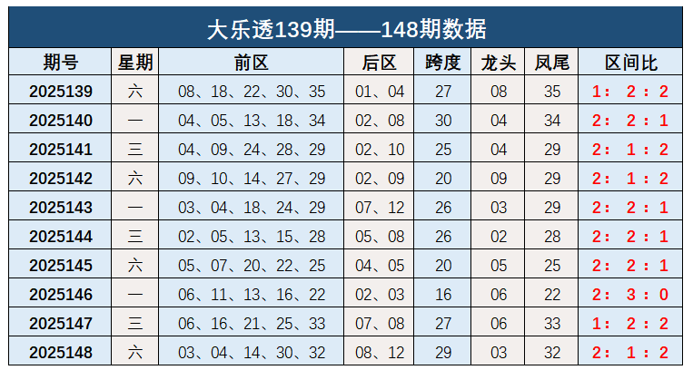 大乐透第2025148期出奖号统计:前区03、04、14、30、32,后区08、12。前区跨度29,龙头03,凤尾32,区间比比2:1:2。