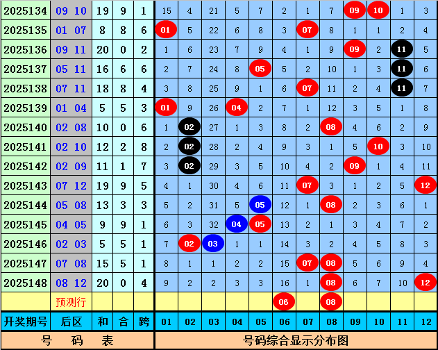 后区分析(一区01-04,二区05-08,三区09-12):上期后区开出奖号08和12,最近10期后区三区落号比为8:14:4,本期后区关注号码06、08、09、10、11,后区两码参考06、08。
