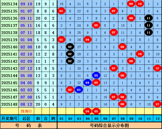 后区上期开出奖号08和12,该组合历史上出现了37次,其下期奖号频次分别为:号码03、05、10出现10次,08、11出现7次,04、09出现6次,01、06出现4次,07、12出现3次,02出现2次,本期后区参考号码01、02、04、05,精选两码04和05。