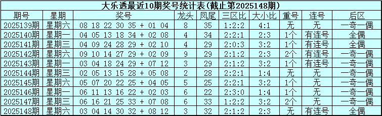 大乐透第2025148期奖号为:03、04、14、30、32+08、12。其中前区三区比为2:1:2,大小比为2:3,没有出现重号,包含连号,后区为全偶号码。
