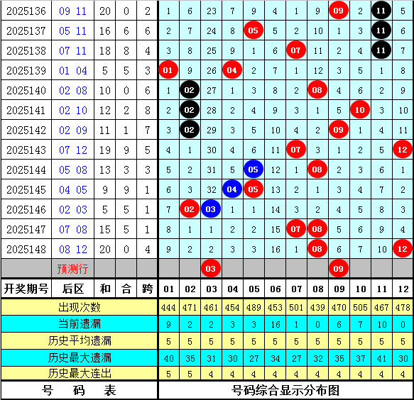 和值跨度:上期和值开出83,对比第2025147期和值下降了18个点位,本期预计和值在大号区域热出,看好出现在91周围。